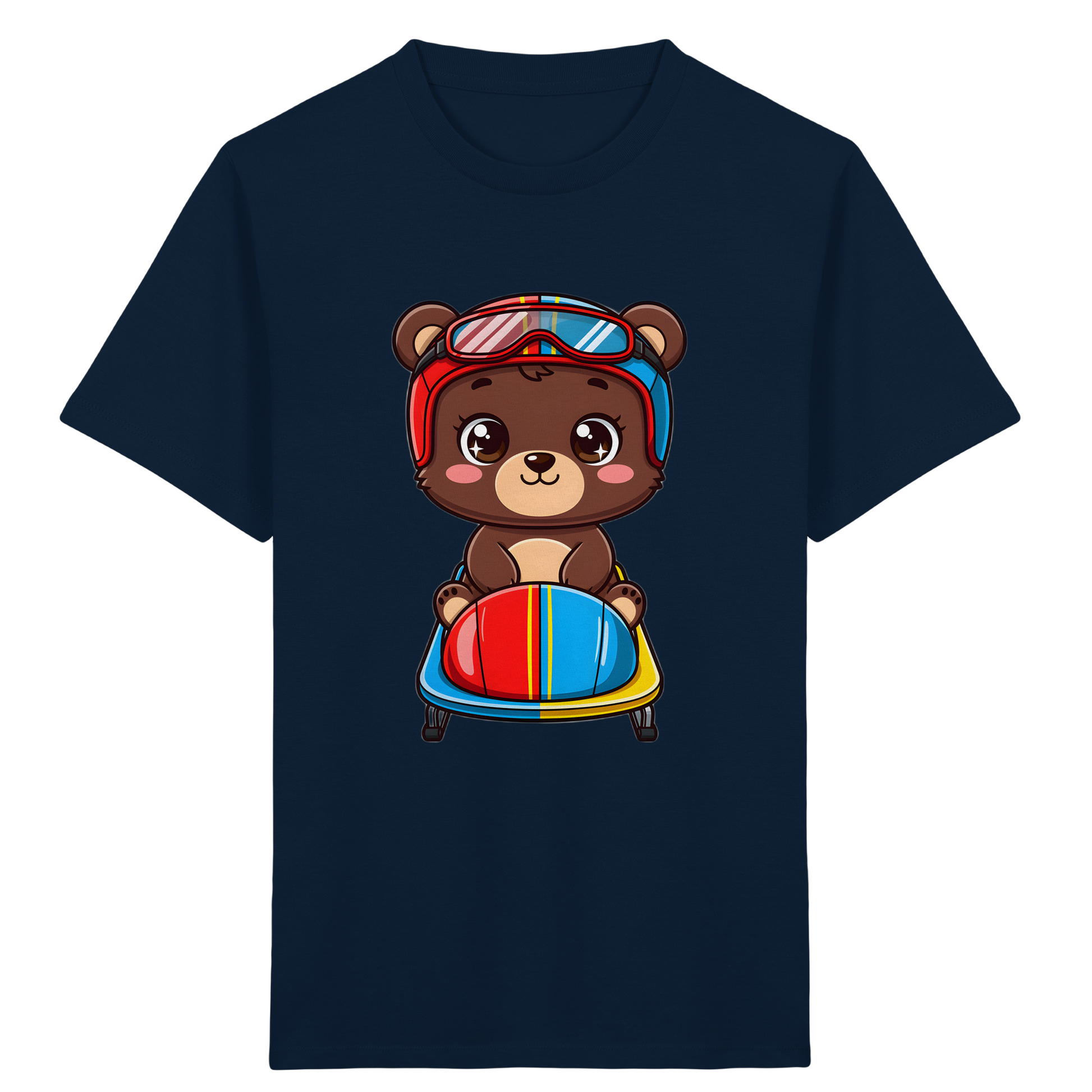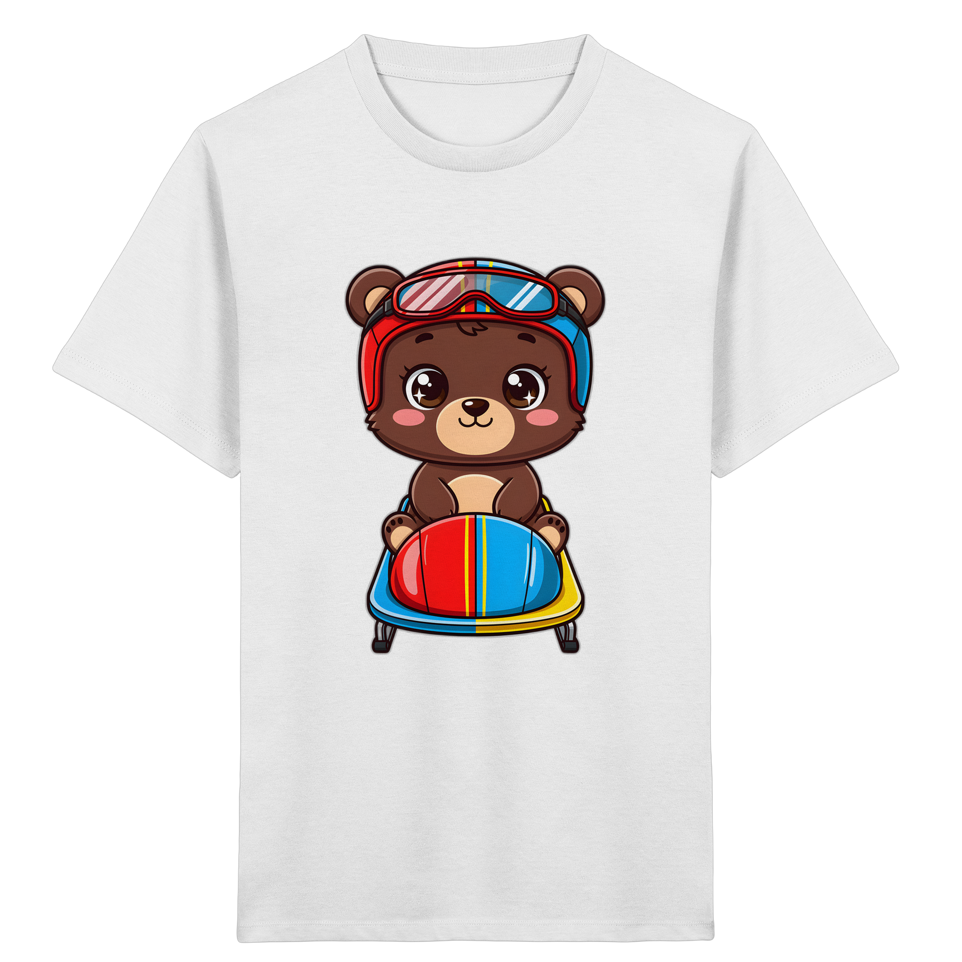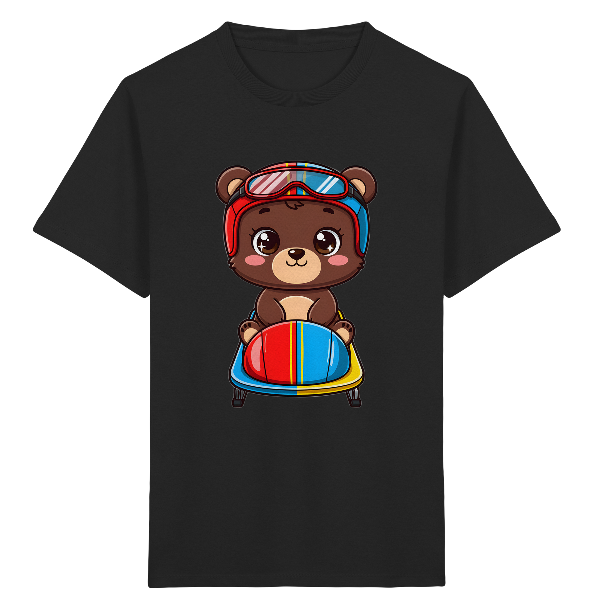 Entdecken Sie das perfekte T-Shirt für kleine Abenteurer! Unser liebevoll gestaltetes Kinder-T-Shirt zeigt einen entzückenden Cartoon-Braunbären, der mit Rennhelm und Brille auf einem Bob sitzt. Dieses farbenfrohe Design mit leuchtenden Rot-, Blau-, Gelb- und Brauntönen, kombiniert mit klaren schwarzen Umrissen, ist ein echter Hingucker und wird die Fantasie Ihres Kindes beflügeln.