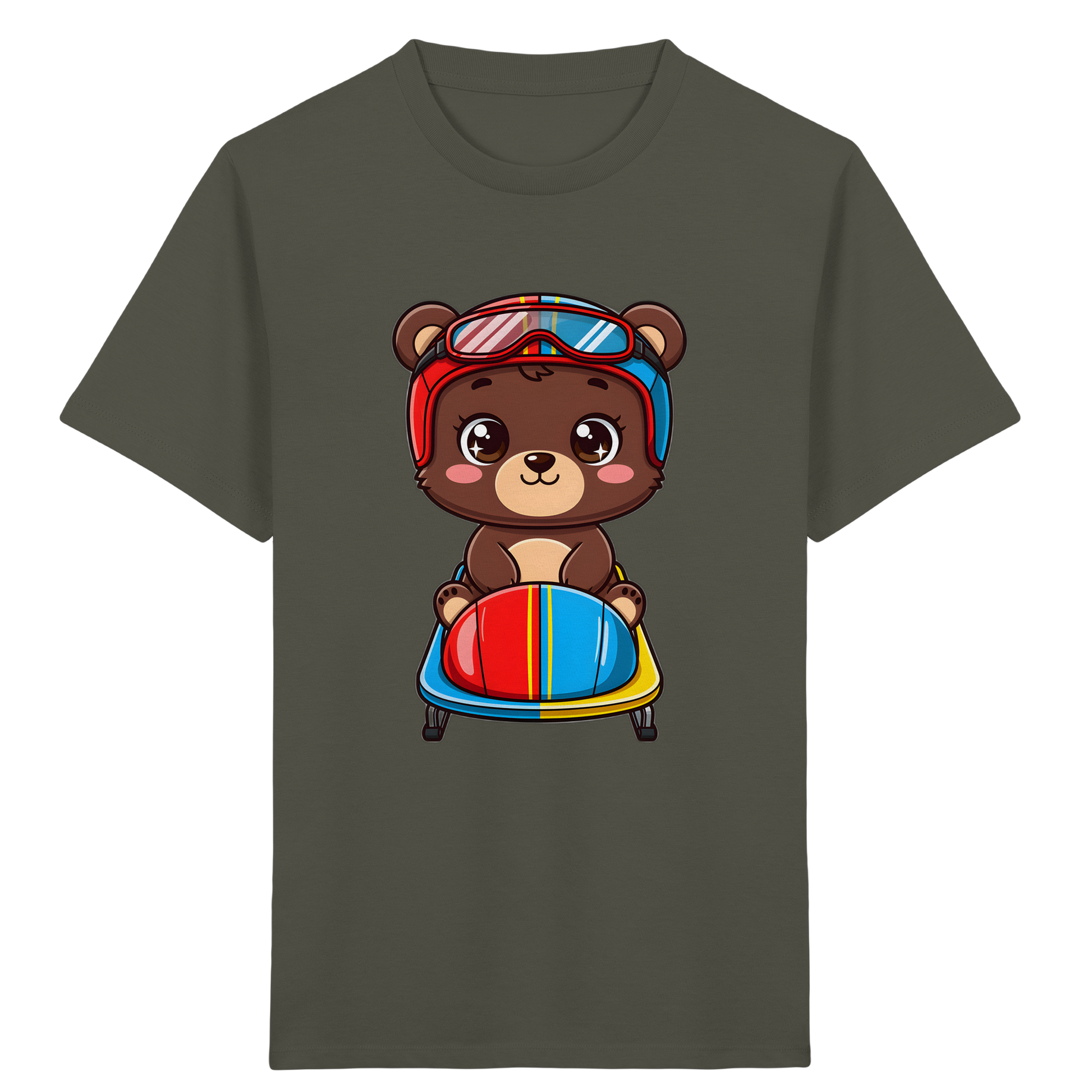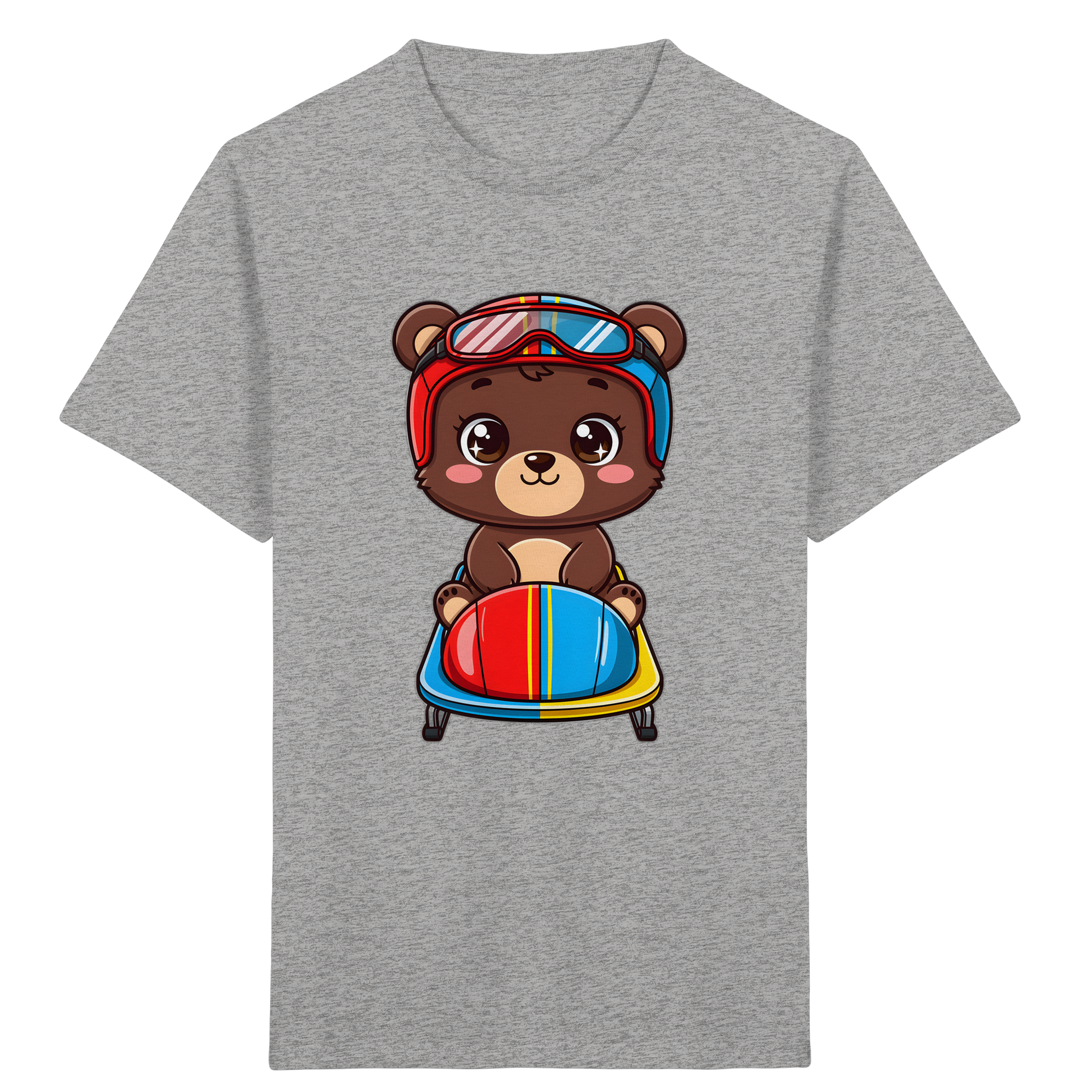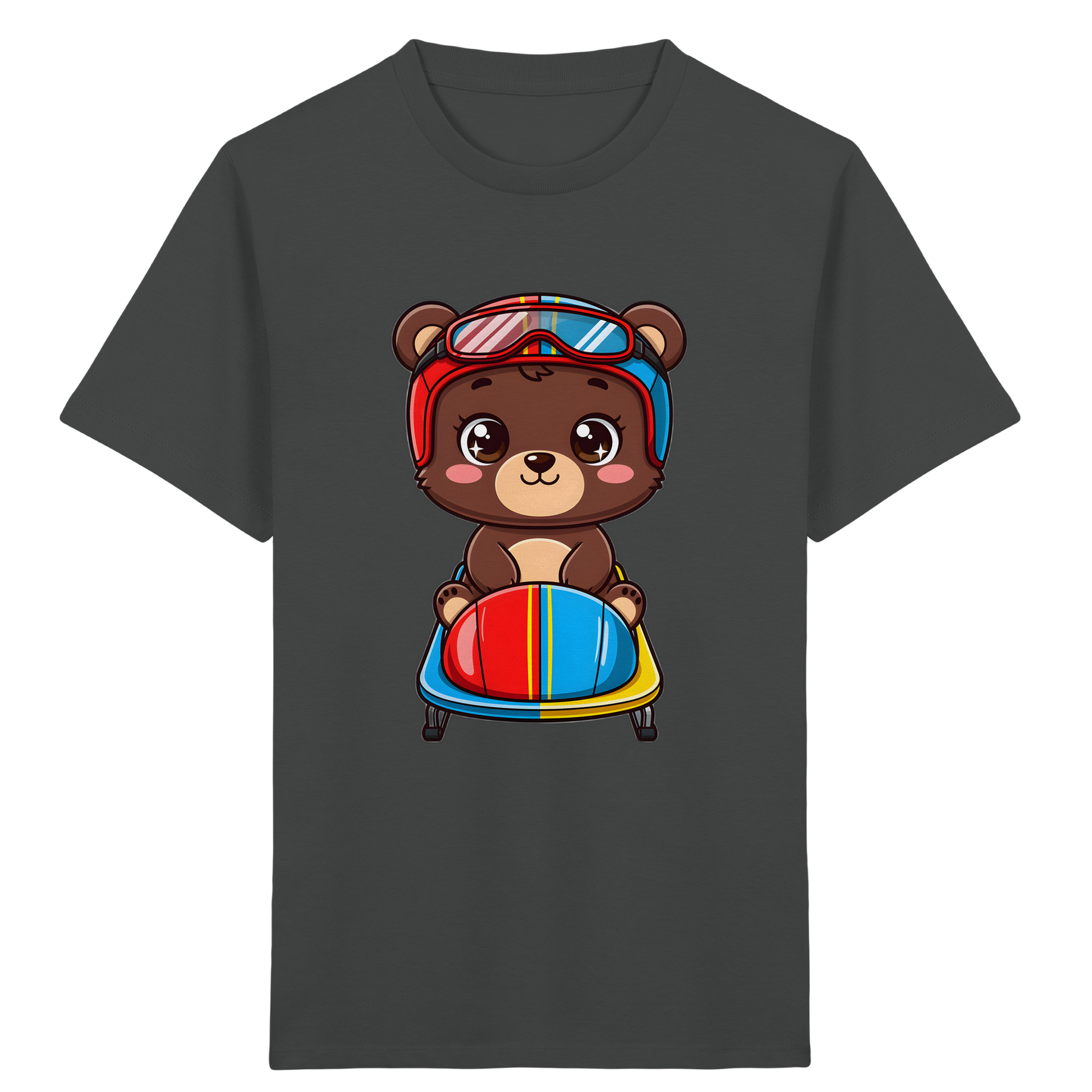 Entdecken Sie das perfekte T-Shirt für kleine Abenteurer! Unser liebevoll gestaltetes Kinder-T-Shirt zeigt einen entzückenden Cartoon-Braunbären, der mit Rennhelm und Brille auf einem Bob sitzt. Dieses farbenfrohe Design mit leuchtenden Rot-, Blau-, Gelb- und Brauntönen, kombiniert mit klaren schwarzen Umrissen, ist ein echter Hingucker und wird die Fantasie Ihres Kindes beflügeln.