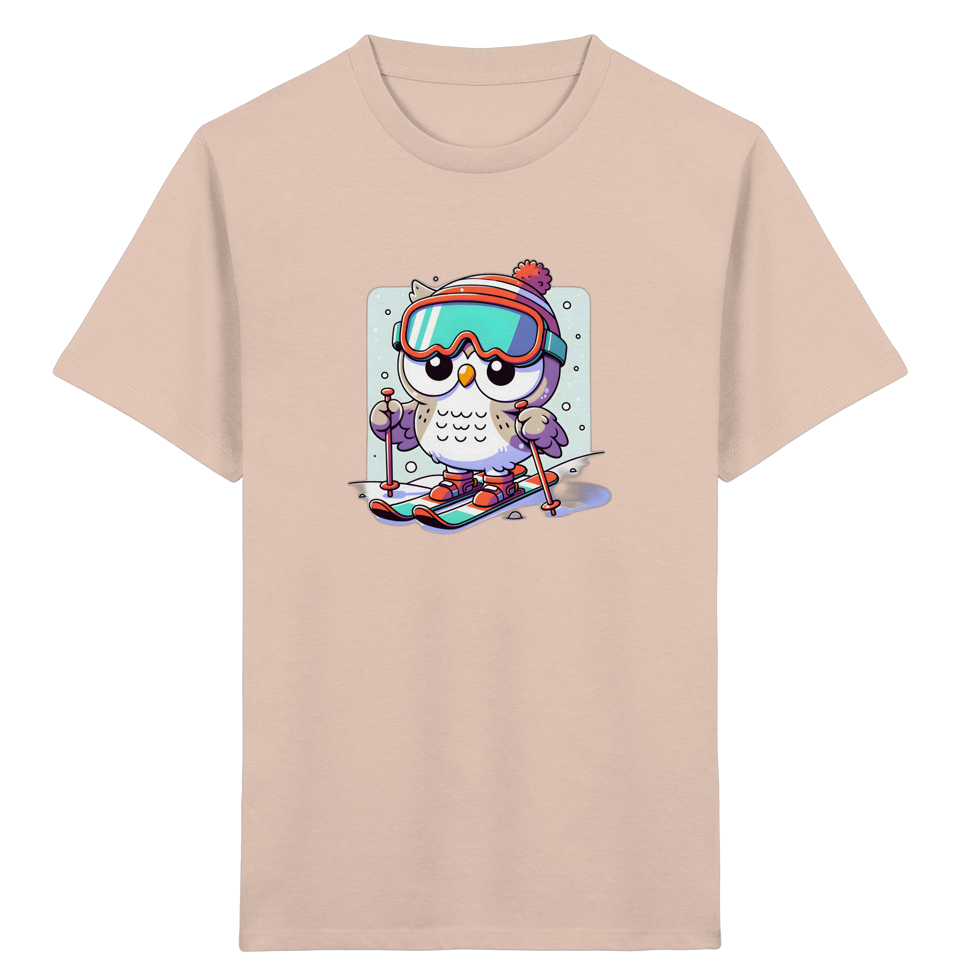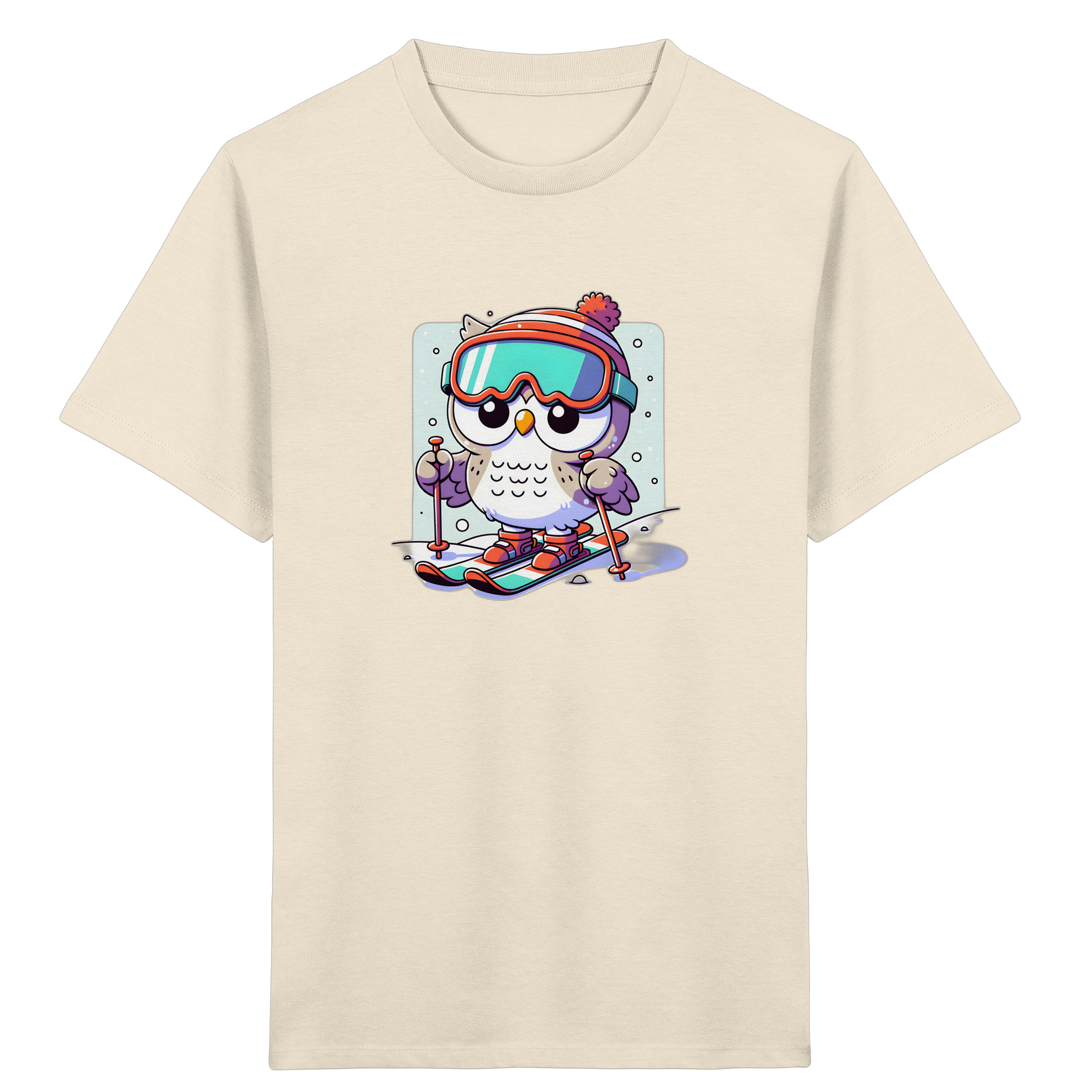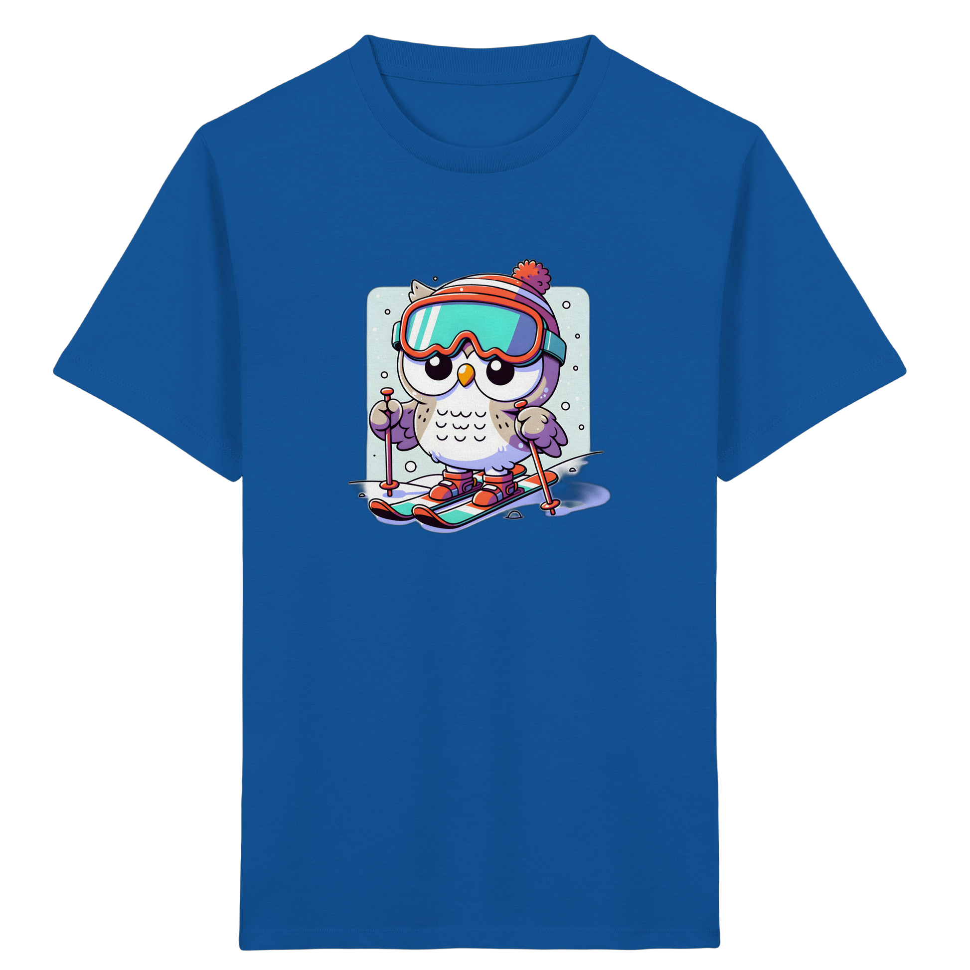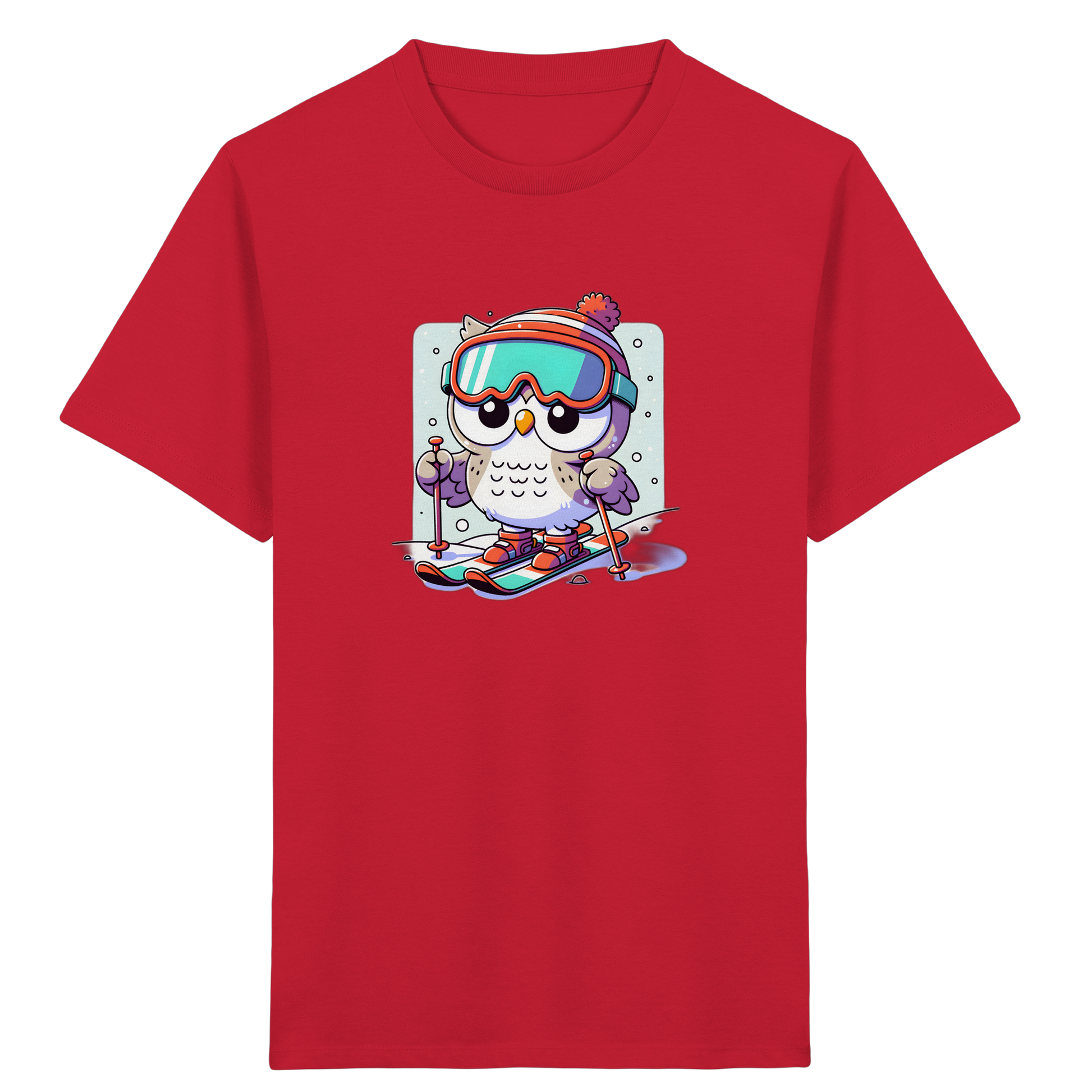 Entdecken Sie unser bezauberndes Kinder-T-Shirt mit einer fröhlichen, cartoonartigen Eule, die auf Skiern die Pisten hinuntersaust! Dieses T-Shirt ist nicht nur ein Kleidungsstück, sondern ein echter Hingucker für kleine Winterfans. Das Design besticht durch seine leuchtenden Farben und den modernen, flachen Stil, der Kinderherzen höherschlagen lässt. Warme Farben wie Orange und Rot für die Skiausrüstung, kombiniert mit kühlen Türkis-Akzenten, machen das Design lebendig und ansprechend.